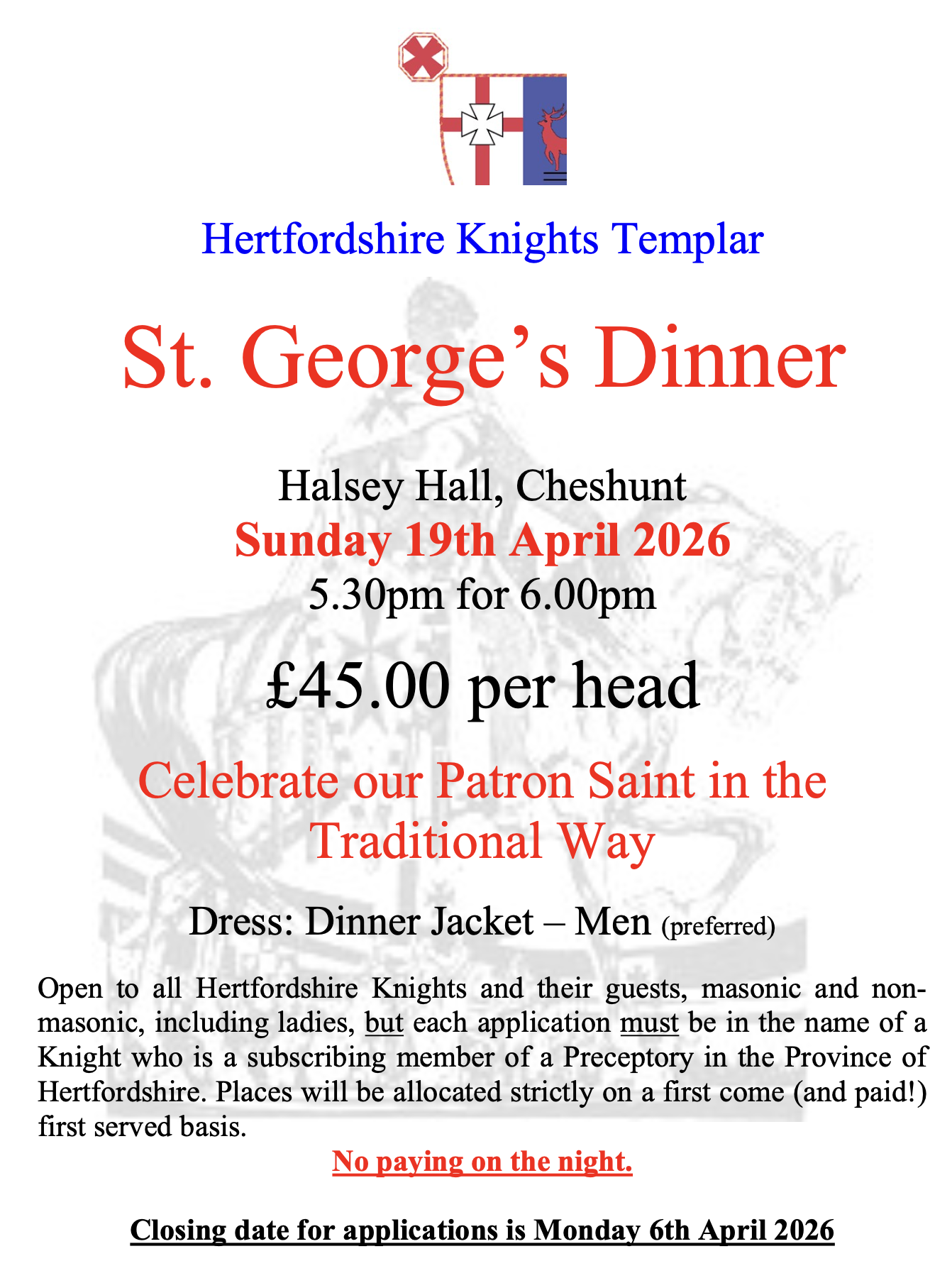 Open to all Hertfordshire Knights and their guests, masonic and non-masonic, including ladies, but each application must be in the name of a Knight who is a subscribing member of a Preceptory in the Province of Hertfordshire. Places will be allocated strictly on a first received (correctly completed application form and payment) basis. No paying on the night.