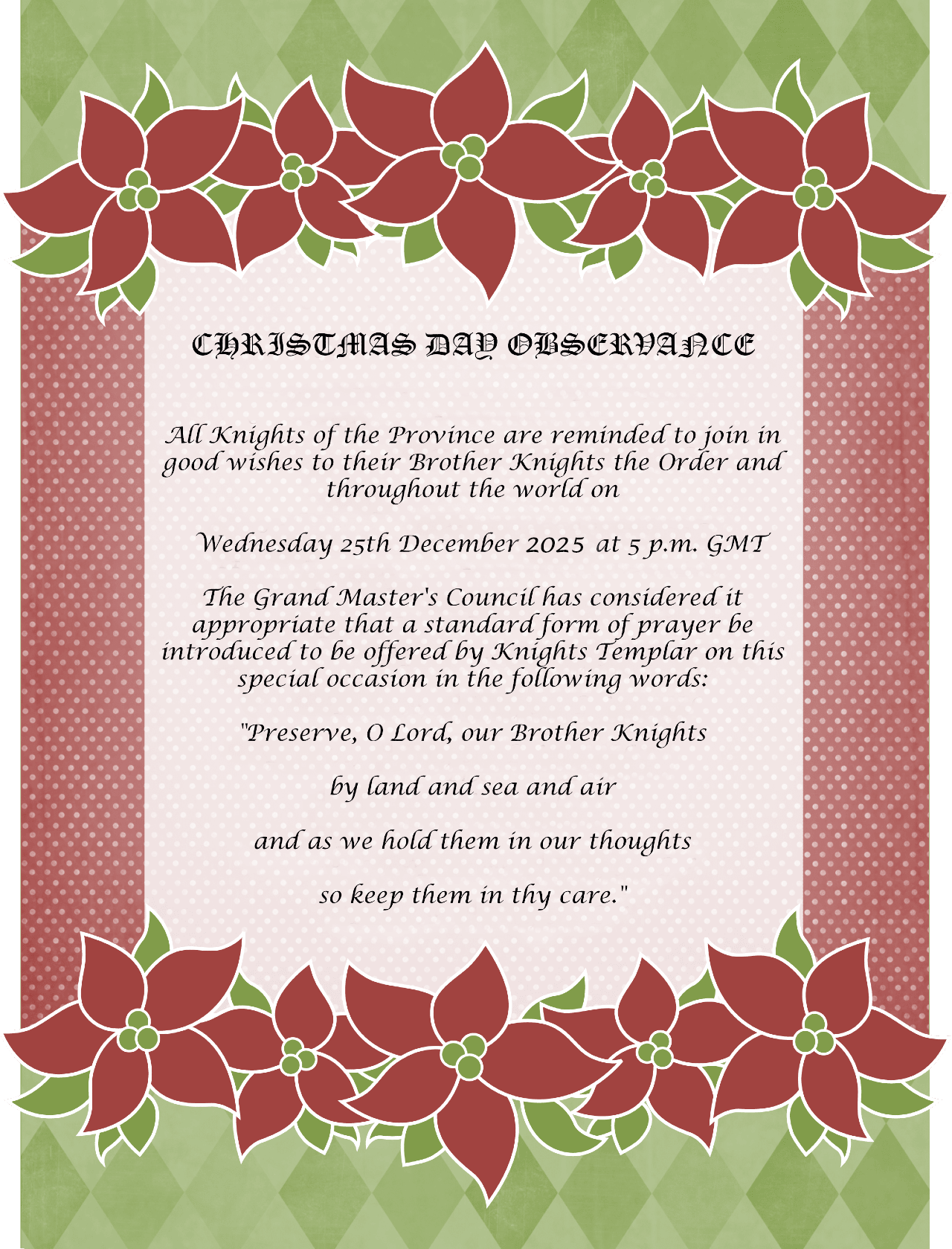 On behalf of the Provincial Sub-Prior and I, we offer our congratulations to those who received Honours, and I look forward to investing you with your Malta ranks at the Macleod meeting in September.