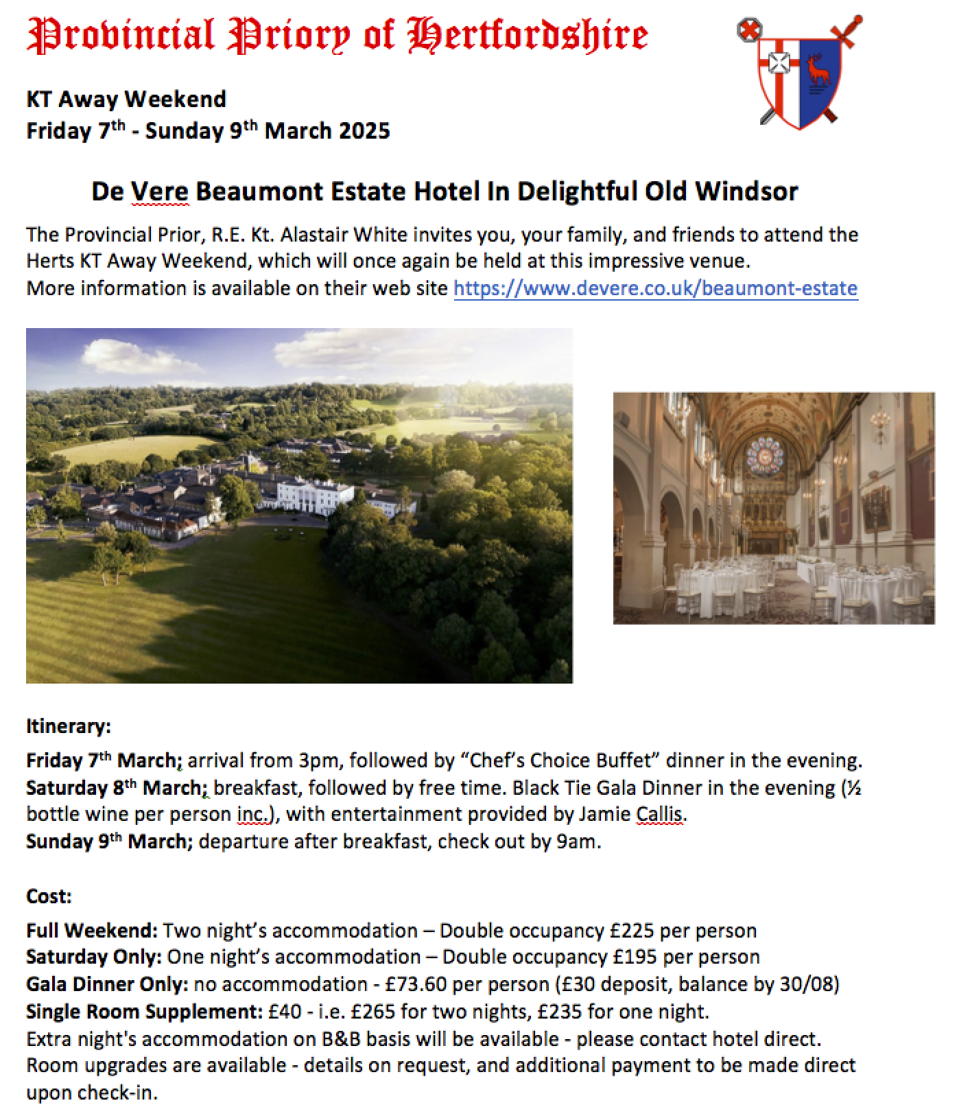 Open to all Hertfordshire Knights and their guests, masonic and non-masonic, including ladies, but each application must be in the name of a Knight who is a subscribing member of a Preceptory in the Province of Hertfordshire. Places will be allocated strictly on a first received (correctly completed application form and payment) basis. No paying on the night.